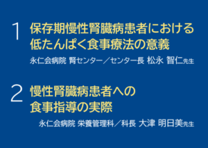 動画「︎保存期慢性腎臓病患者における低たんぱく食事療法セミナー」を公開しました。
