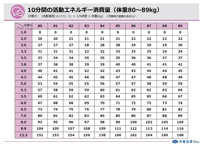 10分間の活動エネルギー消費量(体重80~89㎏)