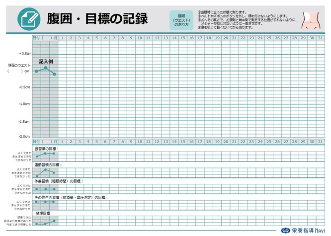 折れ線グラフで1ヶ月間の腹囲(ウエスト)と目標の記録ができます