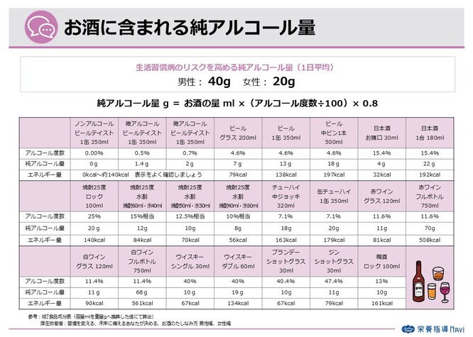 お酒に含まれる純アルコール量とエネルギー量がわかる資料です